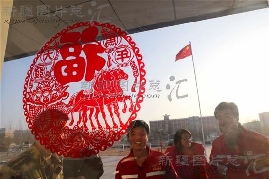 2014年1月26日,武警新疆伊吾县淖毛湖边防派出所,各族群众在和官兵们贴窗花。