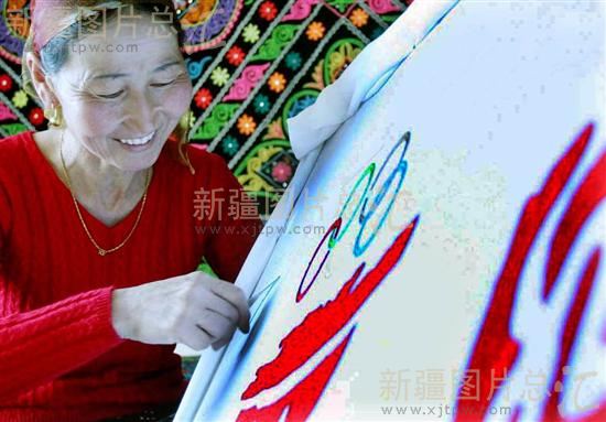 2008年3月31日,卡毕拉在制作刺绣。2008年是中国的奥运年, 新疆阿勒泰地区阿勒泰市哈巴河县齐巴尔乡玛依沙斛村哈萨克族村民卡毕拉精心制作了一 幅《哈巴河喜迎奥运》刺绣作品,祝愿北京奥运会圆满成功。