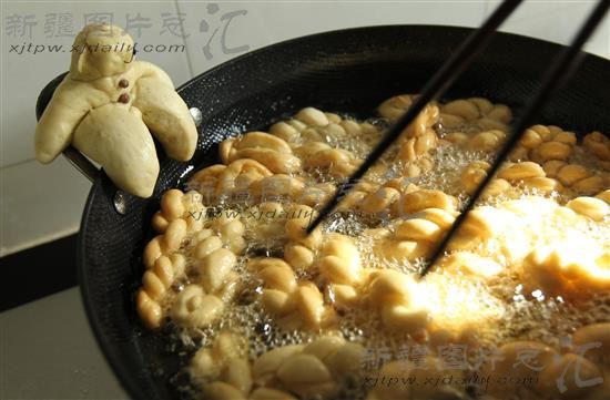 2014年1月26日,哈密市西河区街道东菜园村,居民在炸麻花。