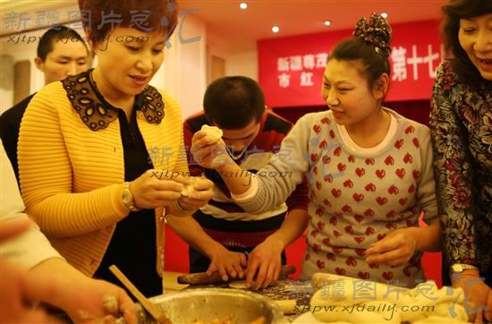 2014年1月27日,孤残儿童和红十字会的工作人员在包饺子。