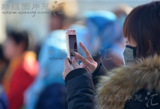 2014年1月27日,巴里坤哈萨克自治县大河镇,用手机拍摄广场上迎新春文艺节目的观众。