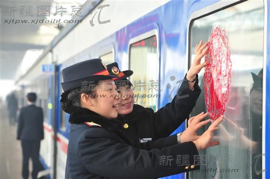 2014年1月28日,乘务员们在由乌鲁木齐开往北京的T178次列车车厢外张贴窗花。