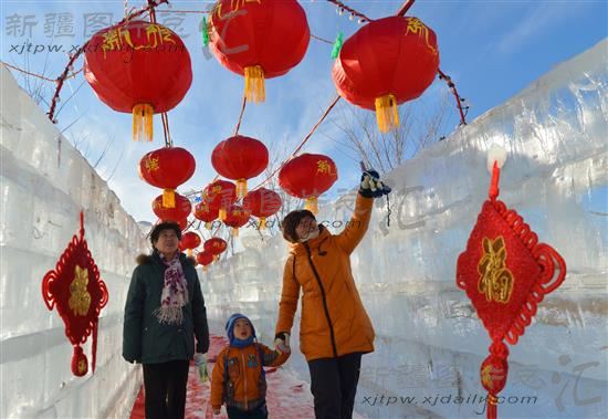 2014年1月28日,参观者在挂满红灯笼的冰雕园里游园。