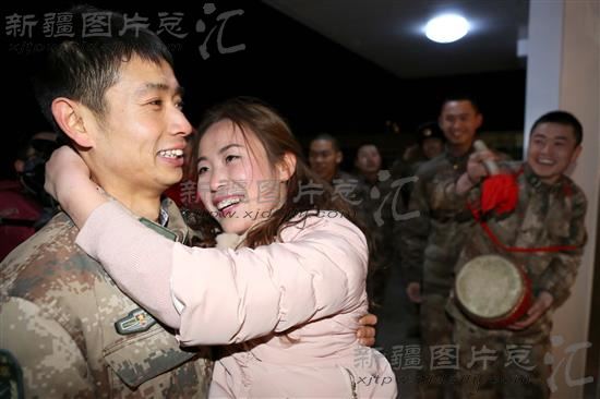 2014年1月28日,新疆军区某边防团老爷庙边防连的中尉军官梁涛抱着妻子杨小婷走进连队。