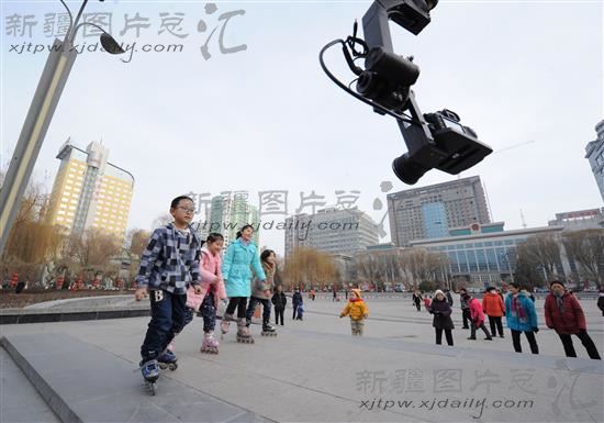 2014年1月27日,库尔勒市大象微电影团队在市人民广场拍摄市民迎新春的公益微电影。
