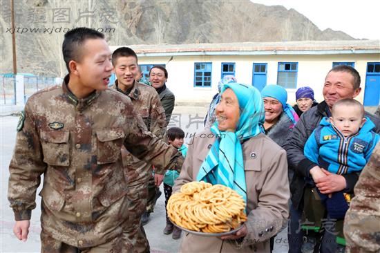 2014年1月30日,驻地萨克族牧民海夏·阿期口尔端着馓子来到新疆军区边防某团苏海图哨所慰问官兵。