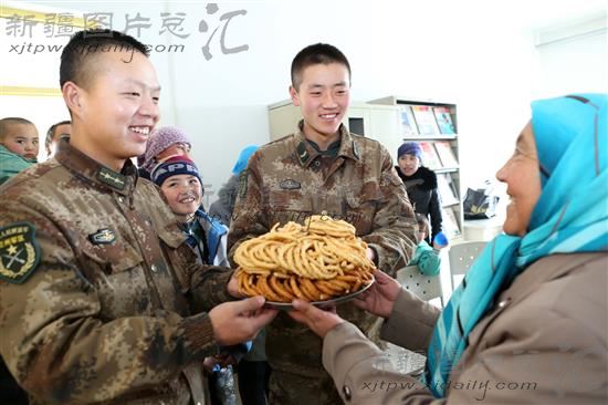 2014年1月30日,驻地萨克族牧民海夏·阿期口尔端着馓子来到新疆军区边防某团苏海图哨所慰问官兵。