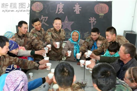 2014年1月30日,驻地哈萨克族牧民和新疆军区边防某团苏海图哨所官兵共迎新春佳节。