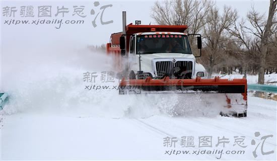 2014年1月30日,新疆阿勒泰地区布尔津县,清雪车辆在217线国道清雪。