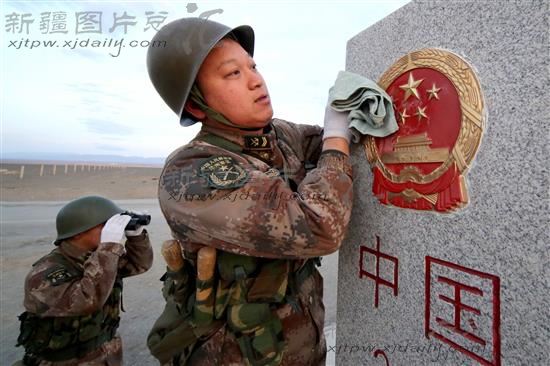 2014年1月30日,驻守在西北边陲的新疆军区某边防团老爷庙边防连的士官姜亮平,在擦世界碑。