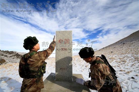 2、1月31日,新疆军区某边防团苏海图哨所巡逻小分队在查看界碑并擦掉灰尘。