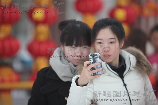 2014年1月30日,几位回家过年的大学生在90团休闲广场游玩。