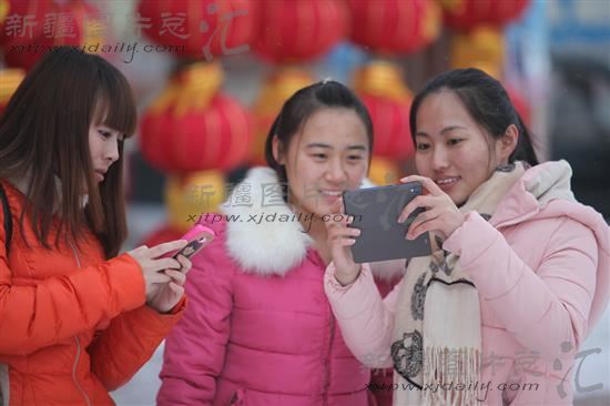 2014年1月30日,几位回家过年的大学生在90团休闲广场游玩。