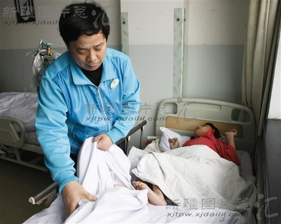 2014年1月29日,乌鲁木齐市养老福利院的护理员黄跃宗在帮助脑瘫患者李峰换尿布。