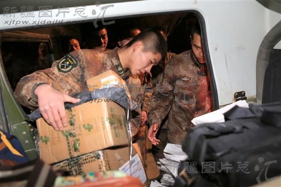 2014年1月27日,史山河(左一)在新疆军区某边防团梧桐沟边防连准备为官兵们分发邮件。