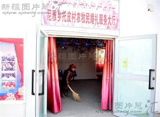 2014年1月27日,民丰县尼雅乡托皮村的村干部在农牧民婚礼服务大厅打扫卫生,为村里一对新人的婚礼做准备。