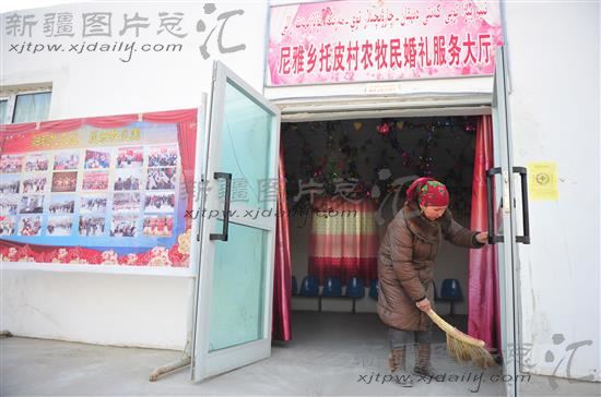 2014年1月27日,民丰县尼雅乡托皮村的村干部在农牧民婚礼服务大厅打扫卫生,为村里一对新人的婚礼做准备。