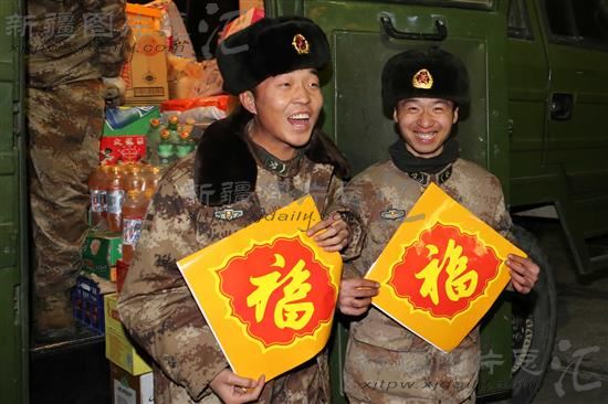2014年1月28日,新疆军区某边防团老爷庙边防连的战士手捧福字合影留念。