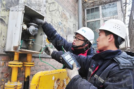 2014年1月29日,新疆燃气(集团)有限公司天然气分公司沙依巴克区管理站技术人员在乌鲁木齐市友好社区检测天然气管线。