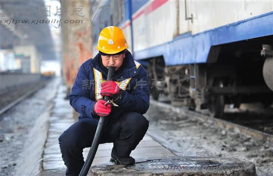 2014年1月28日,乌鲁木齐铁路局乌鲁木齐站客运车间上水工朱崇州,在给刚停稳的火车上水。