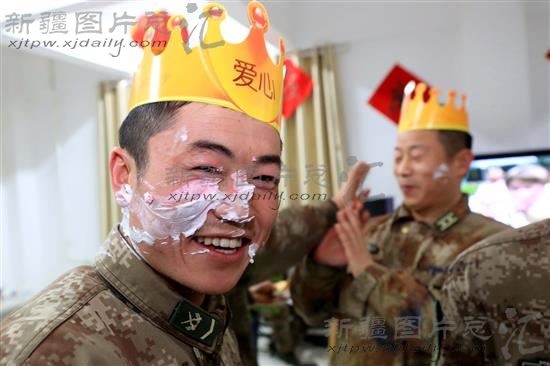 2014年1月31日,新疆军区某边防团老爷庙边防连的“寿星”卢尚飞,脸上被涂满了奶油。