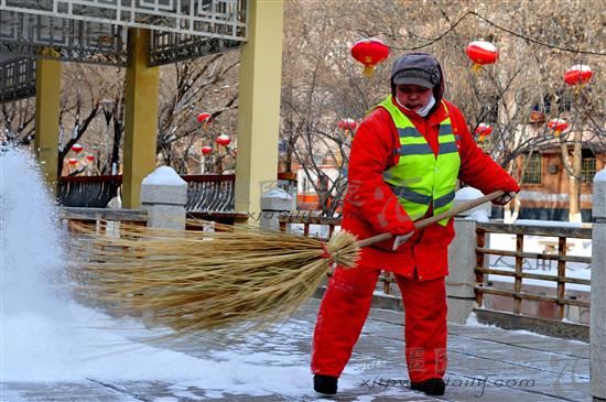 当日是农历正月初二,新疆克拉玛依市降下大雪。环卫工人冒着摄氏零下22℃的风雪严寒坚守工作岗位,及时清扫积雪。