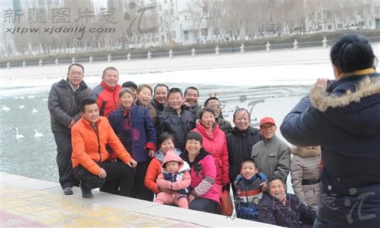 2014年2月5日,在库尔勒市孔雀河边,一个有着20多口人的大家庭在一起拍摄全家福。