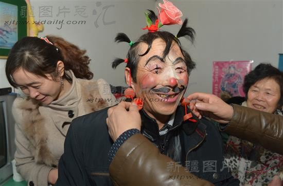 当娶亲的车队离家后,亲友们就开始忙碌着妆扮公婆,公婆被众人围住任其在脸上、头上涂脂抹粉,水果、萝卜、气球等各种道具都会被派上用场,把公婆妆扮的诙谐搞笑,有时新郎的叔叔、姑姑也会被众人作为打扮的对象陪伴公婆左右。