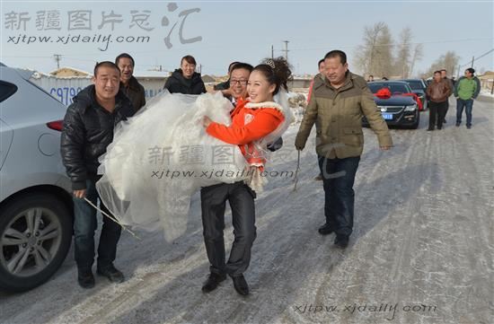 2月5日,巴里坤哈萨克自治县大河镇,娶亲的车队停在离家门很远的地方,新郎抱着新娘等待“公婆”来接。