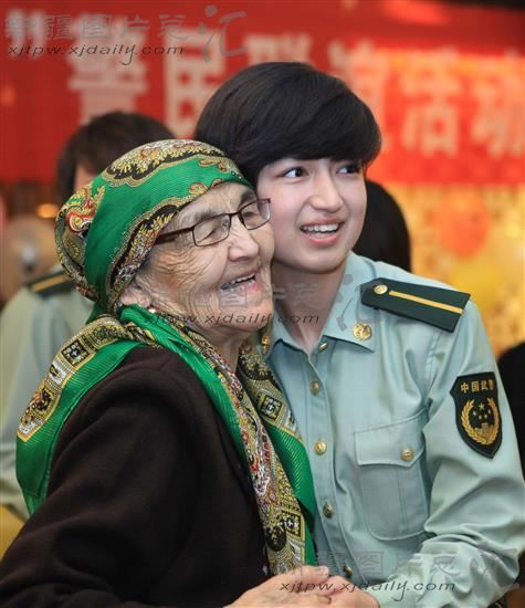 2013年5月11日,公安边防部队乌鲁木齐指挥学校学员穆凯代斯(右)与83岁的孜比亚妈妈一同合影留念。