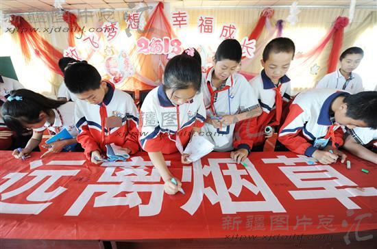 2013年5月29日,库尔勒市第八小学学生在“珍爱生命 远离烟草”的横幅上签名。当天,库尔勒市天山街道龙祥社区组织医护人员在库尔勒市第八小学,开展“5·31”戒烟日活动,通过学生教育家长和身边的人珍爱生命,远离烟草。