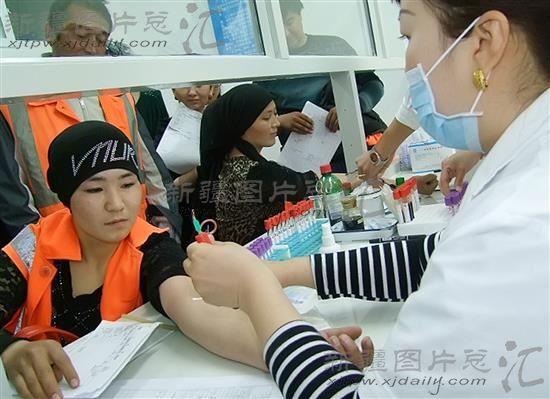 2013年5月6日,环卫工人在接受免费体检。当日,库尔勒市开始为全市1500多名一线环卫工人免费体检,建立健康档案。从今年开始,该市的环卫工人每年都将接受包括免费体检在内的健康服务。
