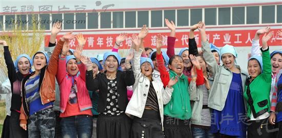 2013年5月16日,雅戈尔伽师制衣厂维吾尔族女工为进厂就业而欢呼。雅戈尔制衣厂2010年4月落户新疆喀什地区伽师县,目前年产值达5亿元,为当地农村维吾尔族女青年提供就业岗位1000多个。