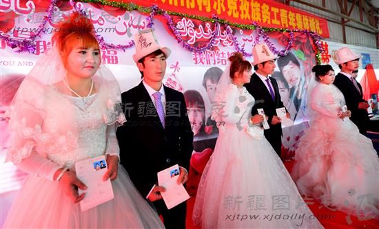 2014年2月4日,6位柯尔克孜族外出务工青年在福建省泉州市和诚鞋业有限公司举行集体婚礼。
