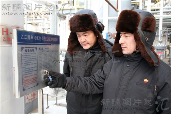 2014年1月28日,独山子石化公司乙烯厂员工在生产车间巡检。