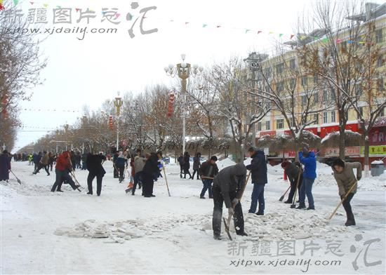 2014年2月7日,裕民县各族干部职工上街清除冰雪。