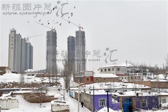 新建的高层住宅和土台民居在伊犁河边遥遥相对。(摄于2014年2月7日)