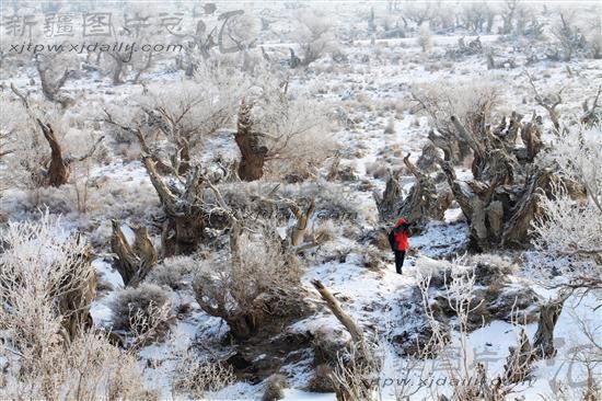 2014年2月7日,新疆哈密地区伊吾县境降下大雪,县域内的一片胡杨林银装素裹。