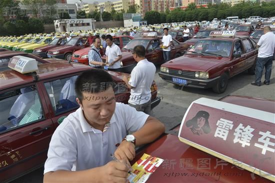 2013年6月3日,一名出租车司机在填写“爱心送考”标示车贴。当日,乌鲁木齐市“学习雷锋、爱心送考”活动启动。