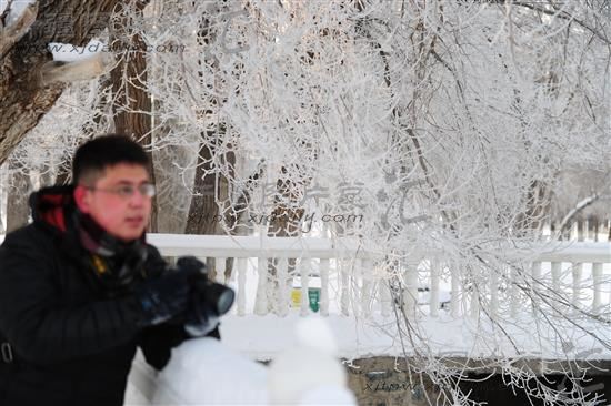 2014年2月11日,塔城市摄影爱好者在塔城文化广场拍雾凇景观。当日塔城市出现雾凇美景。晶莹剔透的雾凇吸引过客纷纷驻足观看。