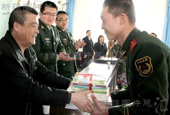 2014年2月10日,哈密市新市区街道北郊路社区工作人员为消防官兵赠送书籍。