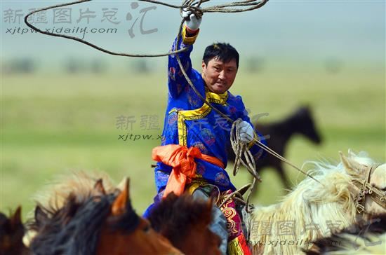 2013年6月1日,牧民赛尔木加甫在套马。当日,和静县额勒再特乌鲁乡盖干塔克勒根村牧民赛尔木加甫,组织亲朋好友,在盖干塔克勒根夏牧场以举办那达慕节的方式庆祝丰收年。赛尔木加甫一家有320只母羊,今年的羊羔成活率达98%;一群马和一群牛也度过了去冬今春的大雪、干旱等自然灾害,目前顺利地转场到夏牧场,存栏率达100%。