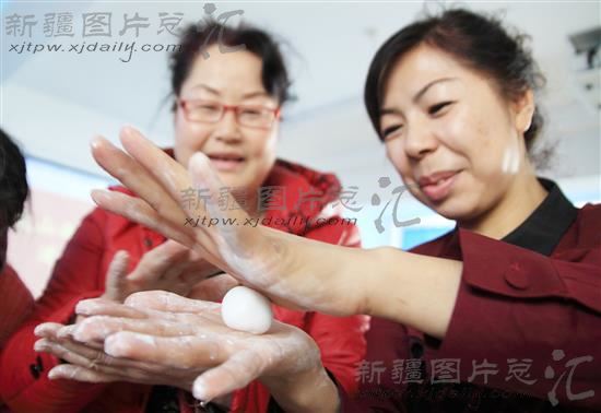 当日,哈密市西河区天山西路社区工作人员和辖区居民一起包元宵,庆新春。