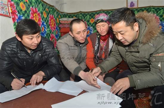 2014年2月12日,驻村工作队员在哈萨克族牧民阿恒拜克(左二)家入户走访。