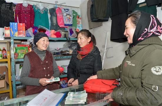 2014年2月11日,妇联工作人员给哈萨克族妇女库丽曼(左)发放贷款。