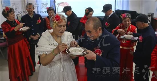 2014年2月12日,在乌鲁木齐市白石桥社区,6对金婚夫妇互喂元宵。