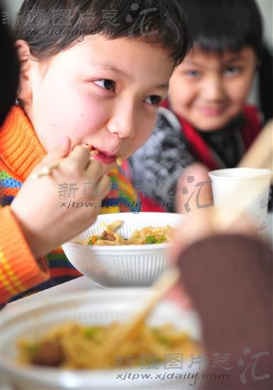2月12日,一名孩子在社区儿童托管站吃午饭。