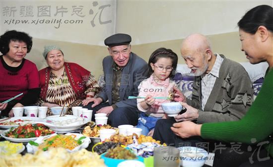 当日,乌鲁木齐市水磨沟区新民路街道爱心社区15号院的维、汉、哈、回等多民族的5户居民相聚在邻居董志芳家中,吃团圆饭迎元宵节。