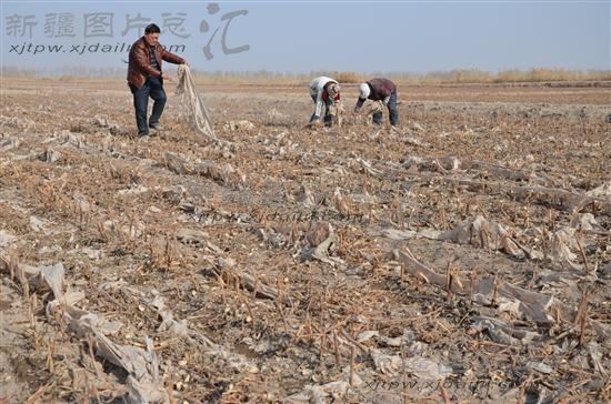 2014年2月12日,新疆生产建设兵团第一师二团一连职工在棉田捡拾残膜。