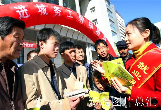 2008年3月20日,乌鲁木齐市沙依巴克区人事劳动和社会保障局干部在给农民工发放并讲解“2008农民进城就业指南”。在这项主题为“进城务工、帮你解难”的活动中,千余名农民工接受了政策、职业、岗位等方面的咨询和帮助。